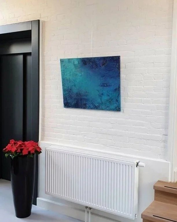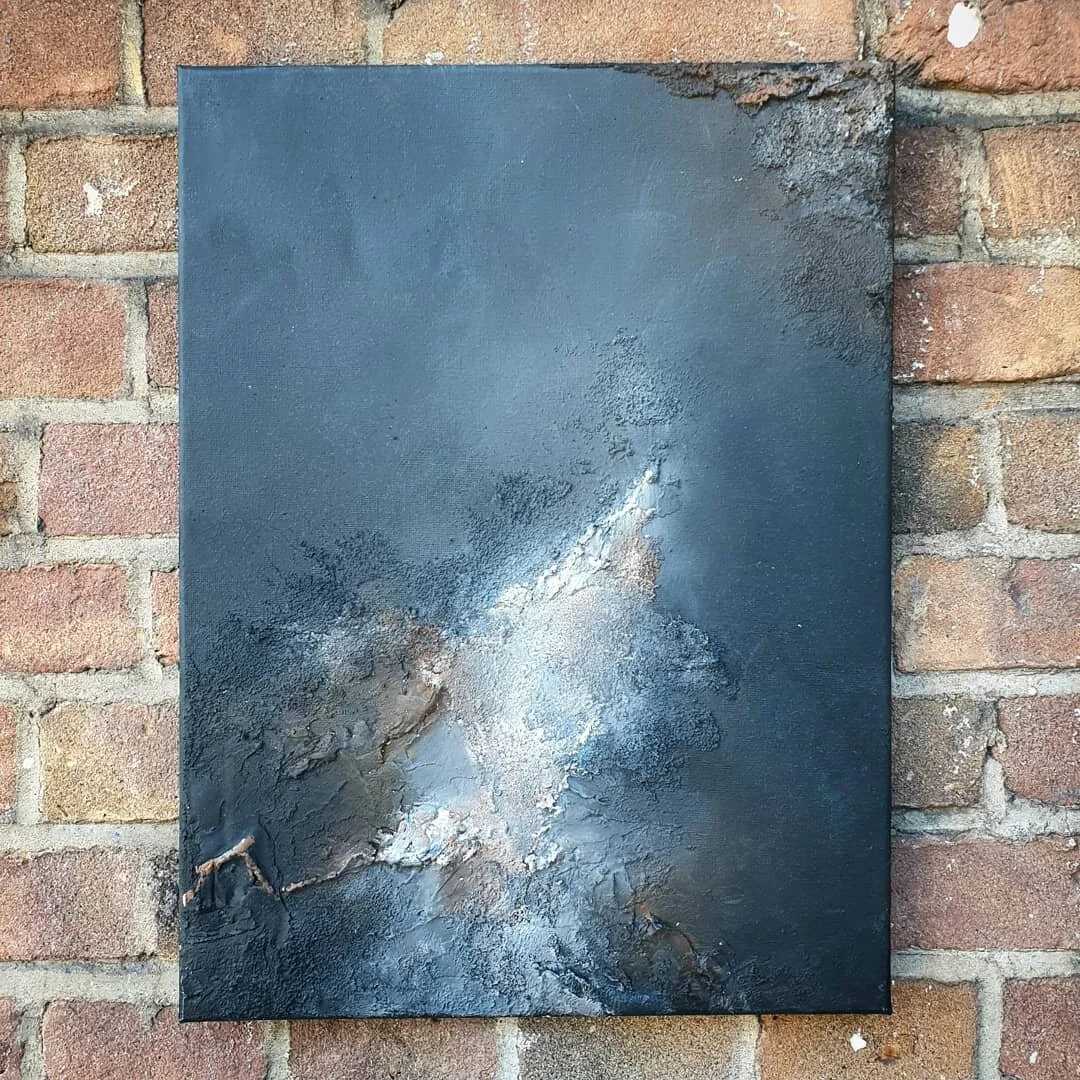 Over the years, Jasmyn has improved her techniques and developed two different styles. Her structured paintings could bring to mind impressive mountains, rocks, and expansive landscapes. Most of the time she incorporates materials like sand of rocks from different countries to create an unique visualisation.